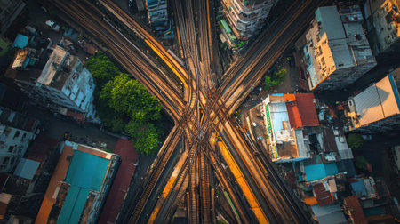 This aerial image captures the intricate network of train tracks intersecting within a bustling urban environment, showcasing vibrant colors and dynamic city life below.