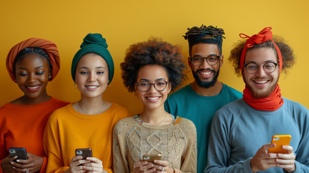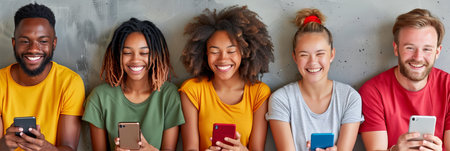 Diverse Group of Young Adults Enjoying Mobile Technology Together, Sharing a Moment of Connectivity