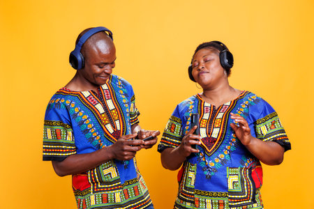 Smiling black man and woman wearing ethnic clothes listening to music in headphones. Cheerful couple in relationship holding mobile phones and enjoying playlist in wireless earphones