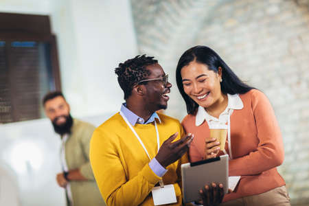 Mixed group of young people, representing various races, enjoy themselves while using their smartphones during a meeting. Adult friends share photos