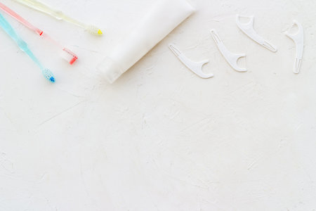 Set of different tools for dental care and hygiene. Top view, flat lay