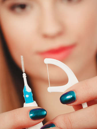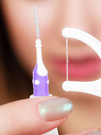 Oral mouth hygiene routine concept. Woman holding small toothbrush and dental floss