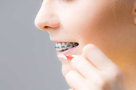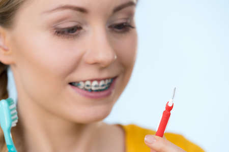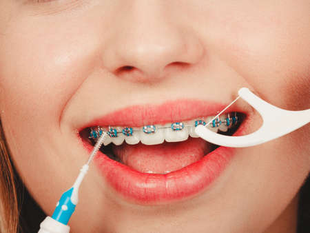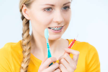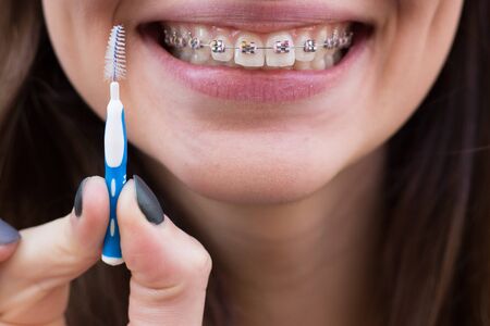 Dentist and orthodontist concept. Young woman with blue braces cleaning and brushing teeth using little toothbrush, interdental brush