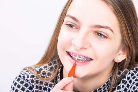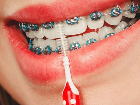 Healthcare Ideas and Concepts. Closeup of Mouth of Teenager Girl With Teeth Brackets Using Interdental Toothbrush for Cleaning.Horizontal Image