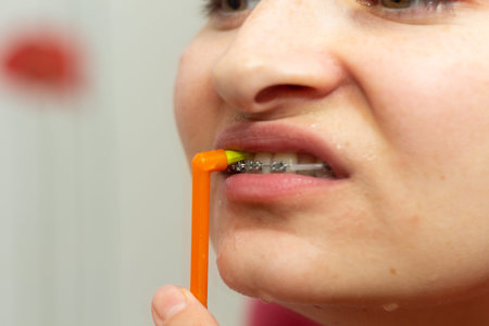 Unrecognizable Caucasian woman cleans braces with a brush. Close-up of female teeth with brackets