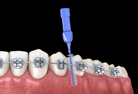 Interdental tooth brush and braces cleaning. Medically accurate 3D illustration of oral hygiene.