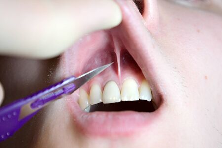 dentist surgeon with a scalpel, the operation in the oral cavity, shortened bridle, a dental procedure