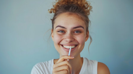 Close-up portrait of a beautiful caucasian woman with a flawless smile holding a toothpick with dental floss on a white background