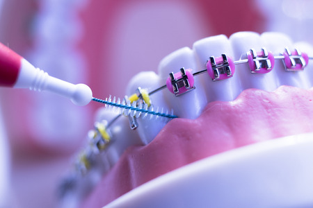Inter dental teeth cleaning brush healthy floss action between each tooth with braces aligners.