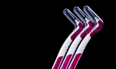Three interdental brush with cover isolated on black background with copy space for text. Dental care concept. Equipment for get rid of food stuck in teeth