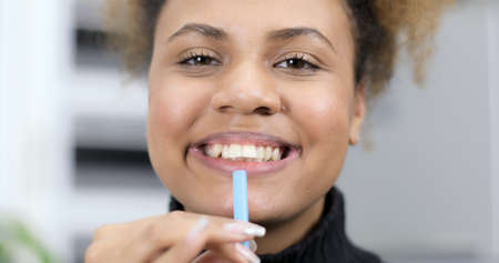 Close-up portrait of a female patient visiting dentist for teeth whitening in clinic,Teeth whitening procedure.