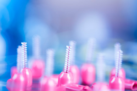 Shallow DOF shot of a toothbrush and interdental brushes on a shiny surface