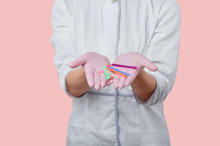 Hands of a doctor who hold multi-colored orthodontic elastic bands. Pink background.