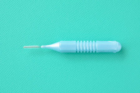 Interdental brush for interdental spaces on green background with copy space, top view, macro