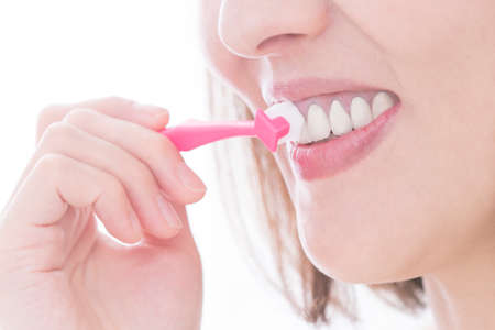 Woman brushing her teeth with interdental brush - dental care concept