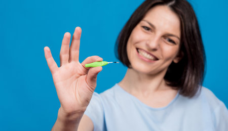 Beautiful happy young woman using interdental brush on blue background