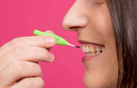 Beautiful happy young woman using interdental brush on the pink background