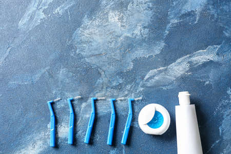 Tooth care and oral hygiene products, dental floss and interdental brush angles on blue, copy space