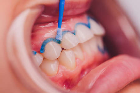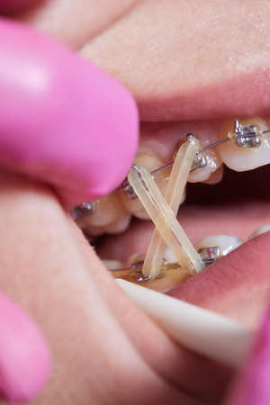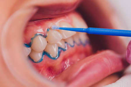 Dental procedure for installing braces close up.The procedure for the care of teeth and gums in the mouth.