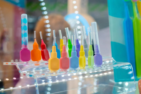 Dental oral care kit - interproximal brushes at medical exhibition. Stomatology, healthcare, hygiene, medicine concept