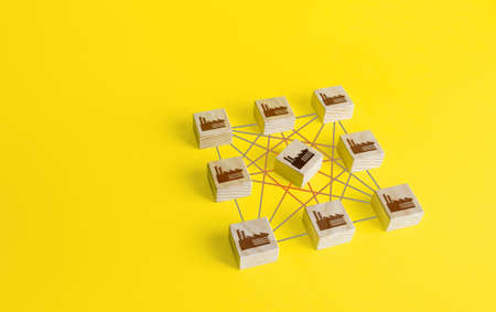 An illustration depicts cylindrical forms in blue and yellow hues, interconnected by strings. The composition emphasizes network and connection. The design features soft lighting, creating a modern, graphic style. Ideal for illustrating concepts in technology or business contexts. This image could be used for various commercial projects.