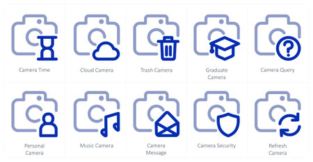 A set of 10 camera icons as camera time, cloud camera, trash camera
