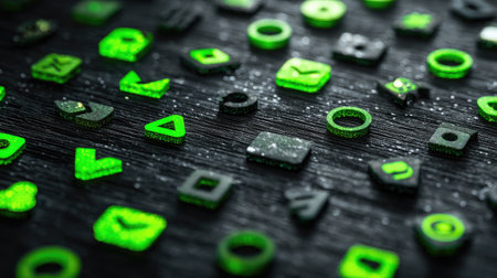 A stunning arrangement of glossy green icons scattered on a dark textured surface, creating an eye-catching visual with sparkling elements and modern aesthetics.