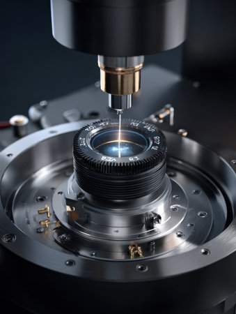 A lens component is being precisely manufactured using advanced machinery in a high-tech workshop. The process highlights engineering expertise and innovation.