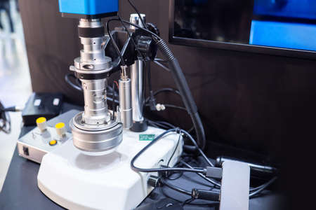 MOSCOW, RUSSIA - OCT 22, 2019. Probe station with microscope, close up