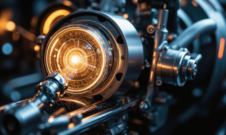 A closeup of a powerful, futuristic engine core glowing with intense blue and orange energy. This image represents a breakthrough in advanced technology, symbolizing innovation, scientific progress, and the future of power and engineering.