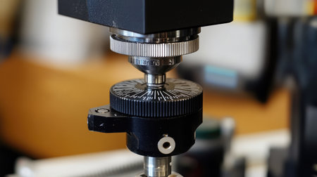 This image features a precision engineering tool with a measurement dialing mechanism, showcasing detailed craftsmanship in a scientific laboratory setup.