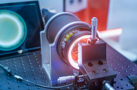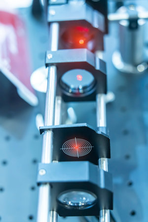 Futuristic laboratory polished metal machine emitting laser beam onto advanced camera lens