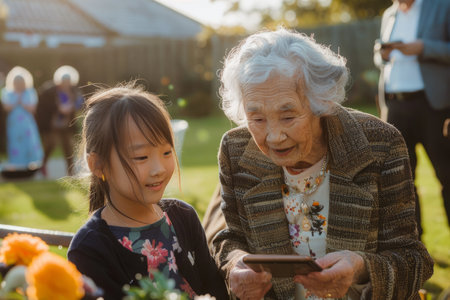 A heartwarming scene unfolds at a garden party as a young girl enthusiastically shares something on her smartphone with her elderly grandmother, reflecting the deep love and closeness they share.