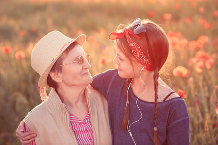 Portrait of a beautiful grandmother and granddaughter in the poppy field.