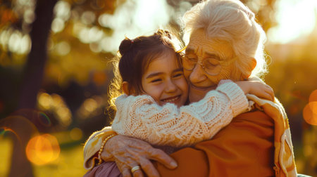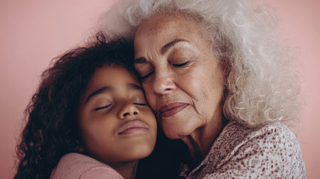 Closeup portrait of a smiling aged female embracing her granddaughter