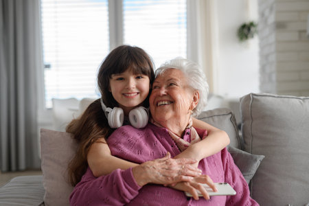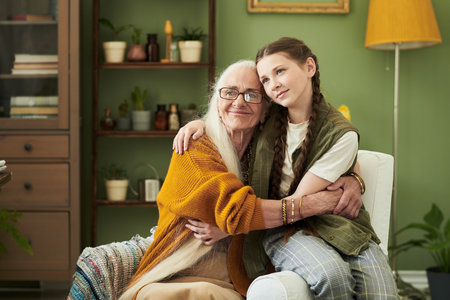 Warm embrace of senior woman and young girl sitting on cozy couch in living room, surrounded by books and plants, conveying love and togetherness
