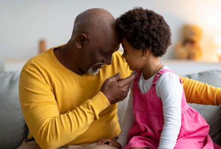 Happy elderly african american man and little girl touches foreheads and enjoying time together at home