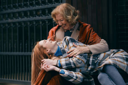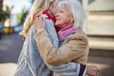 Grandmother and adolescent granddaughter are hugging during the walk on the street in cold weather.