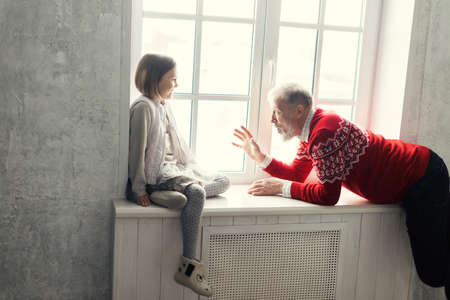 emotional friendly old manis telling fairy tailes to a little attractive girl while standing near the window.emotion. favourite granddaughter
