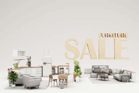 interior design concept Sale of home decorations and furniture During promotions and discounts, it is surrounded by beds, sofas, armchairs and advertising spaces banner. pastel background. 3d render