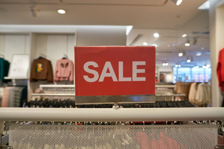 Red sale sign discount on clothing rack in modern shopping mall or department store with copy space. Retail shop promotional event, new product discount, or business marketing advertising concept