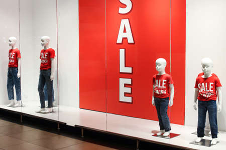 Shop window with mannequins in red overalls with the inscription Sale.