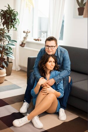 Young couple in love sitting on the couch in the living room at home