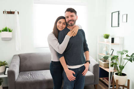 Beautiful girlfriend hugging his smiling boyfriend from the back while making eye contact and standing in the living room home