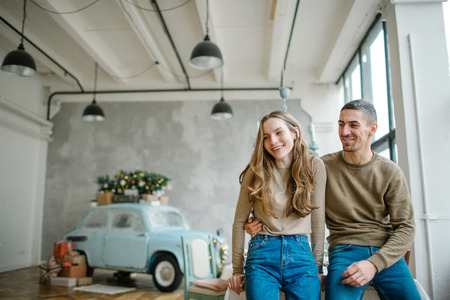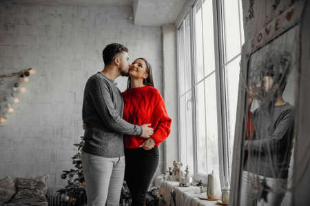 Couple in love tenderly hugs in a cozy home environment and panorama window