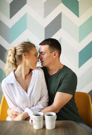 Lifestyle and people concept: Young happy lovely couple have breakfast in the early morning at home, hug, smile.