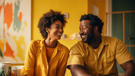 An Asian woman and an African man are sitting on a yellow sofa in a pastel colored room. Both are smiling and engaged in lively conversation creating a warm and friendly atmosphere.