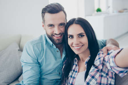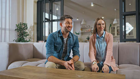 Happy caucasian couple sitting in living room in newly purchased rented apartment. Couple or marriage in his new home. Contemporary bright home with stylish furniture for modern people. Self isolation