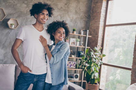 Happy young couple hugging while standing together indoors and looking at the window