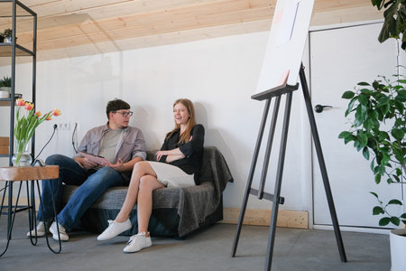 Happy young couple sitting on sofa in living room at home and talking